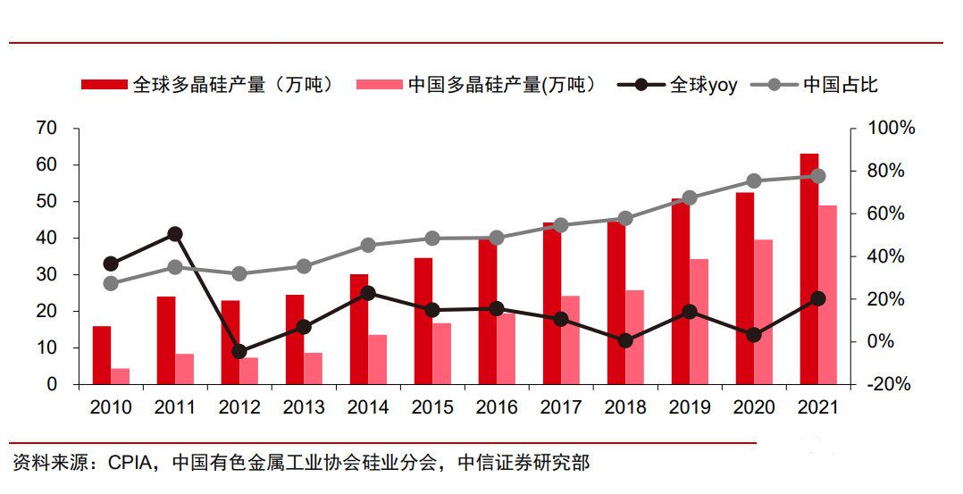 預(yù)計(jì) 2025 年全球光伏級(jí)多晶硅總需求達(dá) 125.4 萬噸,2022-25 年 CAGR 為 19%。測 算公式可簡化為:光伏級(jí)多晶硅需求=晶硅組件需求量×組件硅耗 從核心變量來看,晶硅組件需求量與新增光伏裝機(jī)、容配比正相關(guān);組件硅耗與硅片 厚度、拉棒損耗、金剛線直徑正相關(guān),與切片良率、電池良率、電池轉(zhuǎn)換效率、組件封裝 損失負(fù)相關(guān)。總的來看,晶硅組件需求量逐年快速增長,預(yù)計(jì) 2022-25 年 CAGR 為 24%;受益于電池轉(zhuǎn)化效率提升以及各環(huán)節(jié)工藝改進(jìn),我們預(yù)計(jì)組件硅耗有望逐年下降,從 2022 年 2.64g/W 的水平下降至 2025 年 2.33g/W。